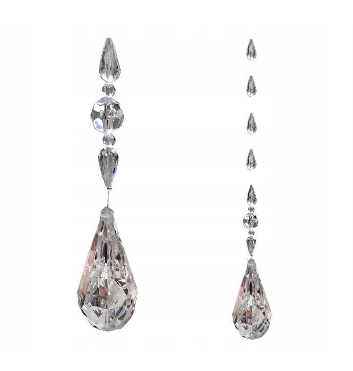 Ovaj elegantni viseći ukras sastoji se od niza kristalnih perli u obliku kapljica veličine 18 mm, dok je donji dio obogaćen velikom, impresivnom kapljicom od 55 mm. Reflektira svjetlost, stvara prekrasne efekte i unosi luksuz u svaki kutak doma.