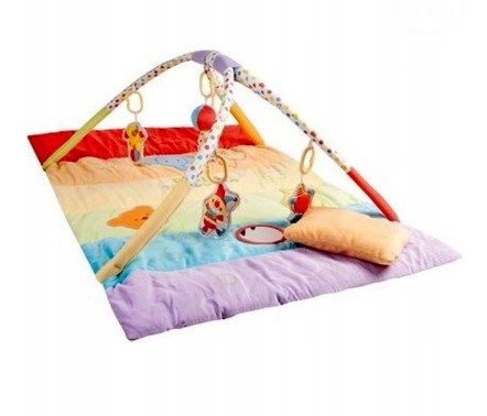 Na površini prostirke dijete će otkrivati šarene cjevčice raznih oblika, veliko ogledalo koje pomaže u prepoznavanju vlastitog odraza te mekan jastučić koji pruža dodatnu potporu tijekom igre. Lukovi iznad podloge opremljeni su visećim igračkama poput zvečki i plišanih loptica, koje potiču hvatanje, dodirivanje i slušanje.